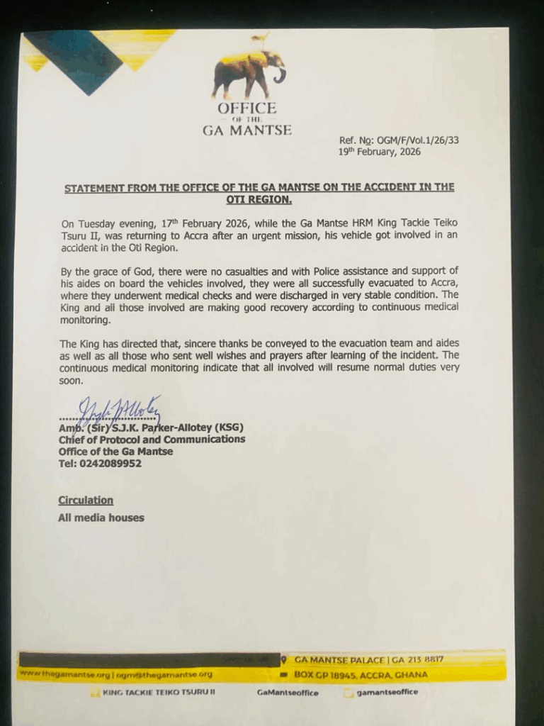 The Office of the Ga Mantse has confirmed that His Royal Majesty, King Tackie Teiko Tsuru II, was involved in a vehicle accident in the Oti Region on Tuesday evening, February 17, 2026, while returning to Accra from an urgent mission.