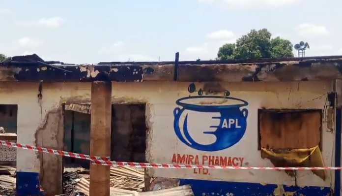 A 14-bedroom house has been completely destroyed by fire at Kwame Danso in the Sene West District of the Bono East Region, leaving several households displaced and one person seriously injured.
