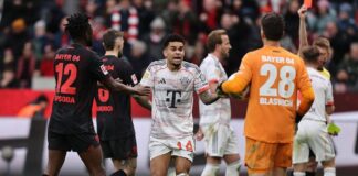 Luis Diaz scored and was sent off for a dive as Bayern Munich finished with nine men but held on for a draw against...
