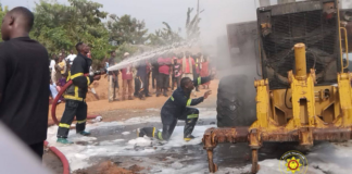 A grader working on the Ajumako–Swedru Road expansion project was destroyed by fire after it caught flames at Ajumako Amia.