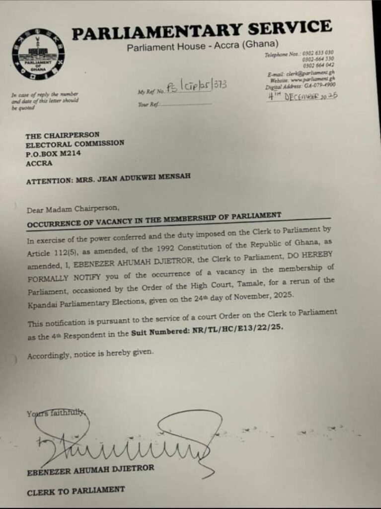 In a letter dated December 4, 2025, and addressed to EC Chairperson Mrs. Jean Mensa, the Clerk explained that the vacancy arose after the High Court in Tamale, on November 24, 2025, annulled the constituency’s parliamentary results and directed that a fresh election be conducted.