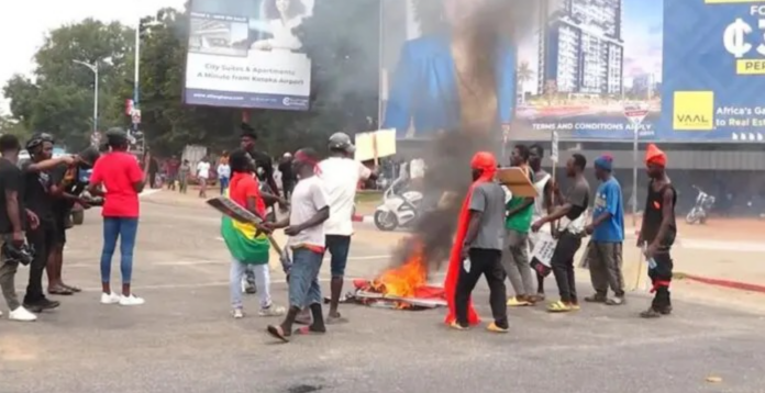The Police reported that demonstrators unlawfully took over the intersection, engaging in disruptive behaviors, including blocking roads with vehicles and stones, setting fires, and harassing other road users.
