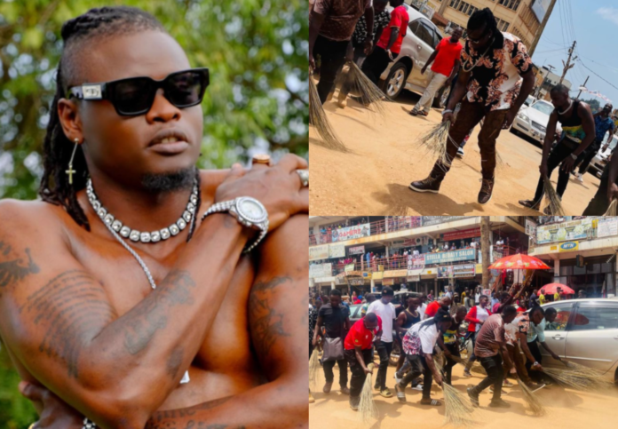 Popular Ugandan singer, Pallaso, has been forced to sweep the streets of Masaka City and apologize to his fans after he turned up late for a music show on Monday night, February 14.