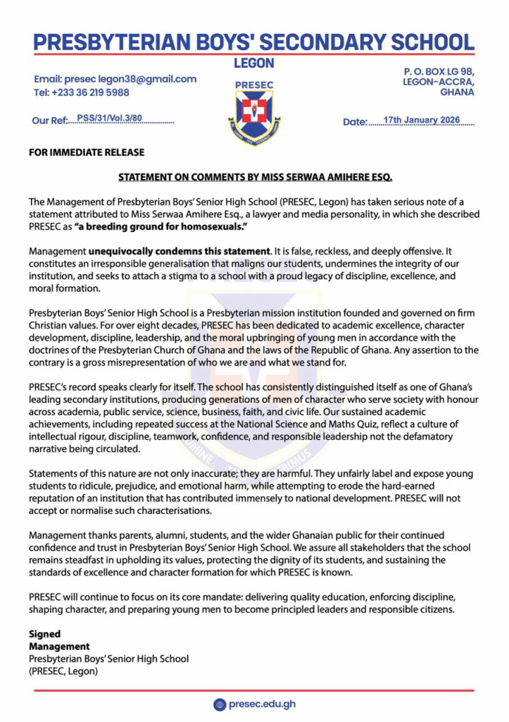 The management of Presbyterian Boys’ Senior High School (PRESEC), Legon, has strongly condemned a statement made by lawyer and media personality Miss Serwaa Amihere, in which she described the school as “a breeding ground for homosexuals” during a live video broadcast.