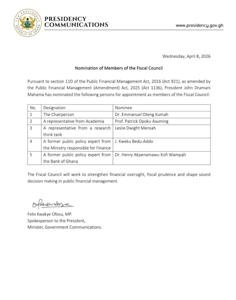 President John Dramani Mahama has nominated five individuals for appointment to Ghana’s Fiscal Council in line with Section 11D of the Public Financial Management Act, 2016 (Act 921), as amended.