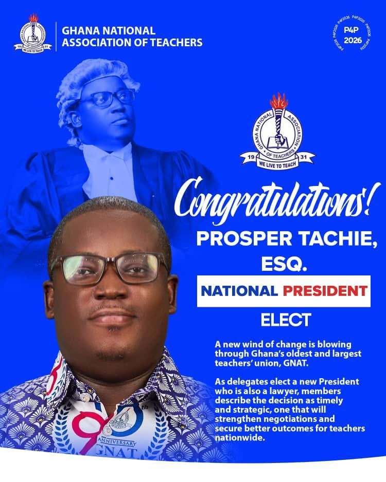 Prosper Tachie, a teacher at T.I. Ahmadiyya Senior High School (SHS), has been elected President of the Ghana National Association of Teachers (GNAT), defeating incumbent Rev. Isaac Owusu in a closely contested race in Accra.