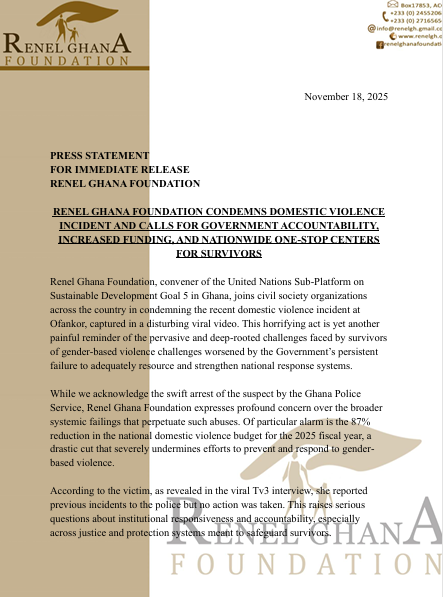 Renel Ghana Foundation has strongly condemned the recent domestic violence incident at Ofankor, which was captured in a viral video, describing it as a troubling reflection of Ghana’s inadequate response to gender-based violence.
