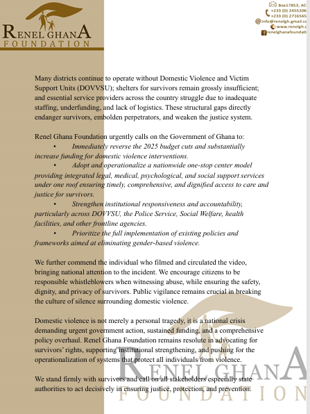 Renel Ghana Foundation further noted that many districts still lack Domestic Violence and Victim Support Units (DOVVSU), shelters remain inadequate, and frontline agencies face underfunding, staffing shortages, and limited logistics.