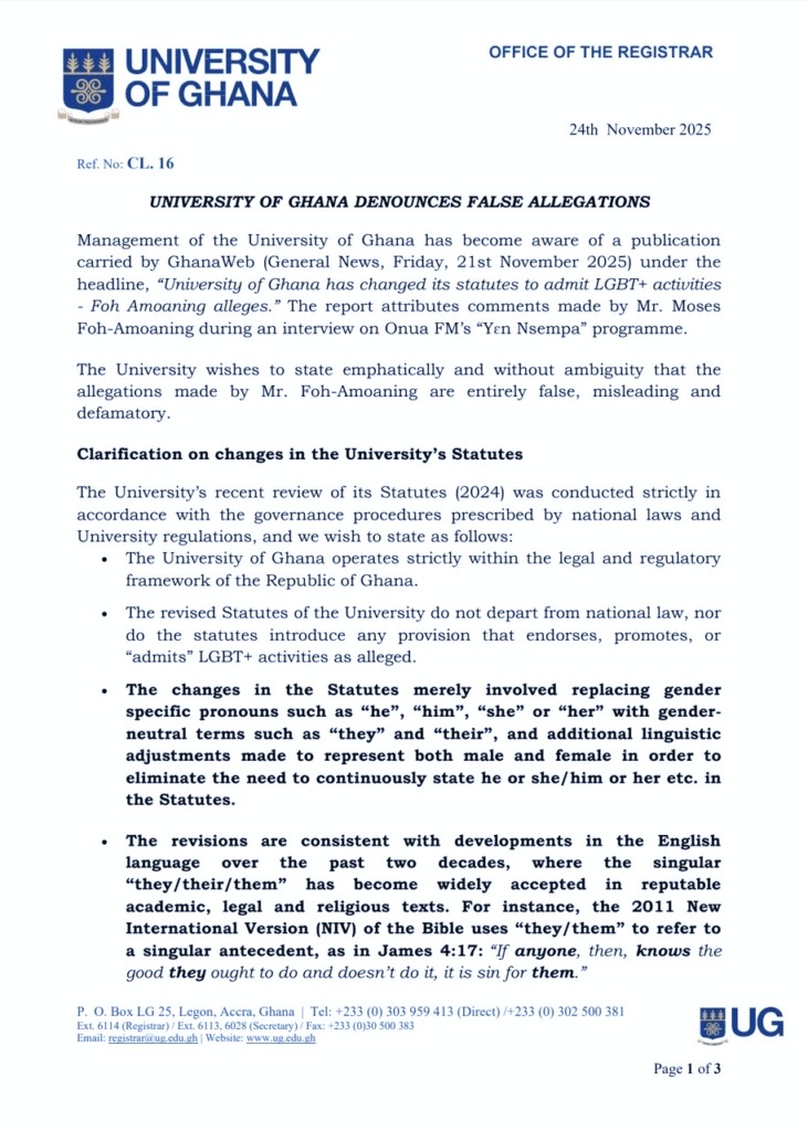 The University of Ghana has demanded an immediate retraction and public apology from private legal practitioner Moses Foh-Amoaning after he claimed the institution had amended its statutes to “admit LGBT+ activities.”