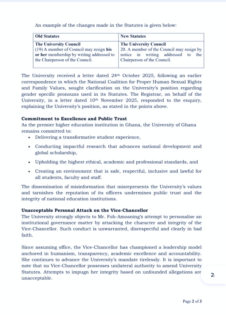 The statement further condemned what it termed an “unacceptable personal attack” on the Vice-Chancellor by Foh-Amoaning, asserting that no Vice-Chancellor has unilateral authority to amend university statutes.