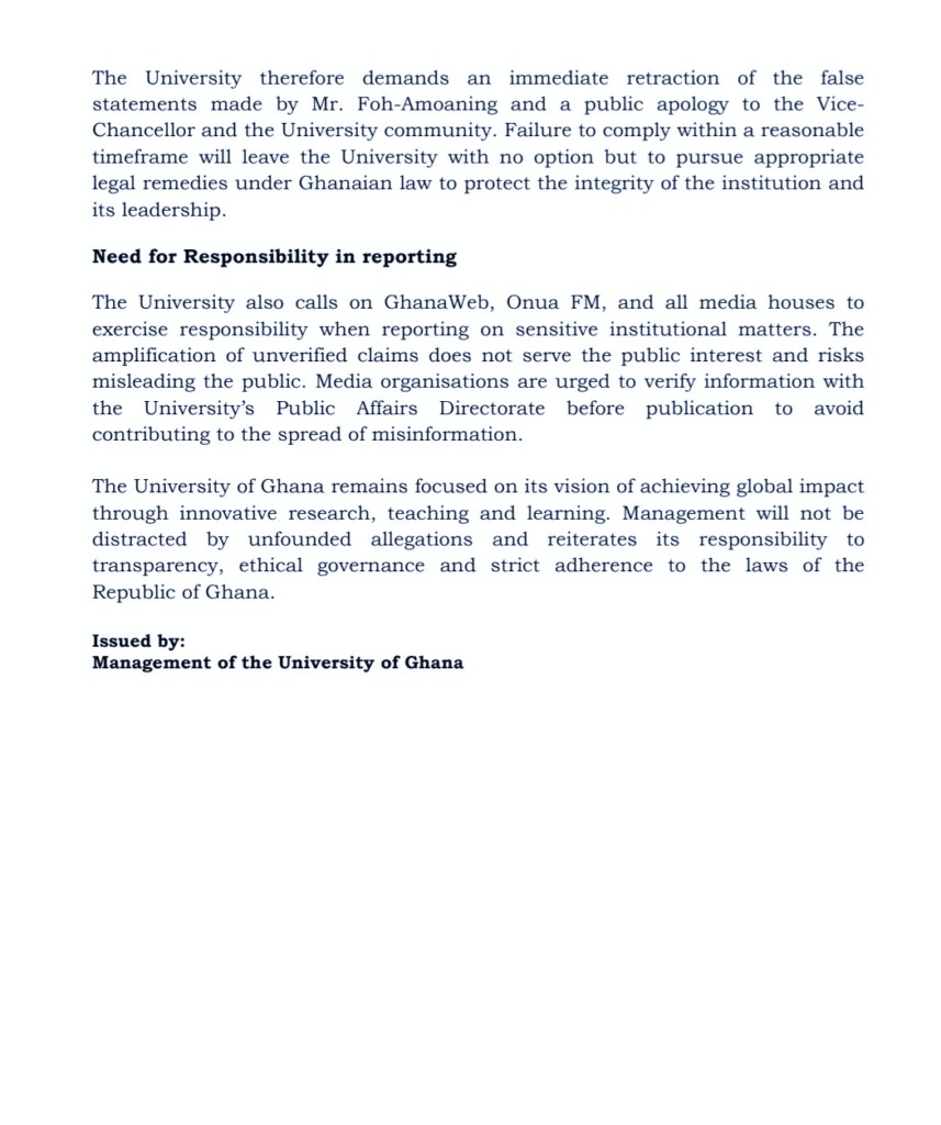 The University has therefore demanded that Foh-Amoaning retract his comments immediately and issue a public apology to the Vice-Chancellor and the wider university community.