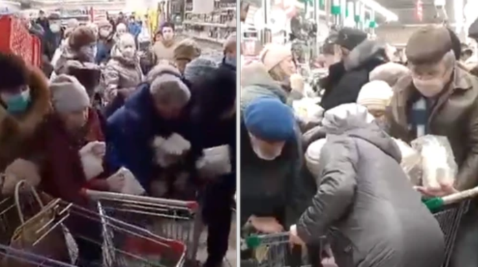 In videos coming out of towns and cities across Russia, crowds of people are shouting, jostling and climbing over each other to grab the last bags of sugar in barren shops.