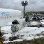 A turboprop plane carrying 36 passengers and crew flipped on its back and caught fire after crash-landing Monday at the main airport in Somalia’s...