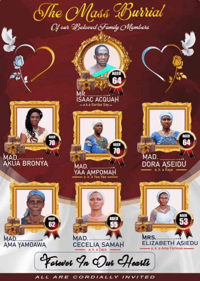 The deceased include one male and six females: 64-year-old Isaac Acquah, 70-year-old Akua Bronya, 70-year-old Yaa Ampomah, 64-year-old Dora Asiedu, 62-year-old Ama Yamoawa, 55-year-old Cecilia Samah, and 53-year-old Elizabeth Asiedu.
