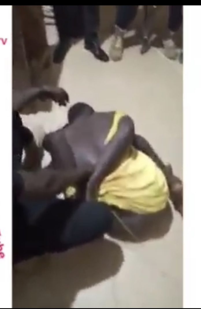 The suspect, who was initially on a chair, fell to the floor as he groans in pain from the beatings with the broomstick scattered all over.