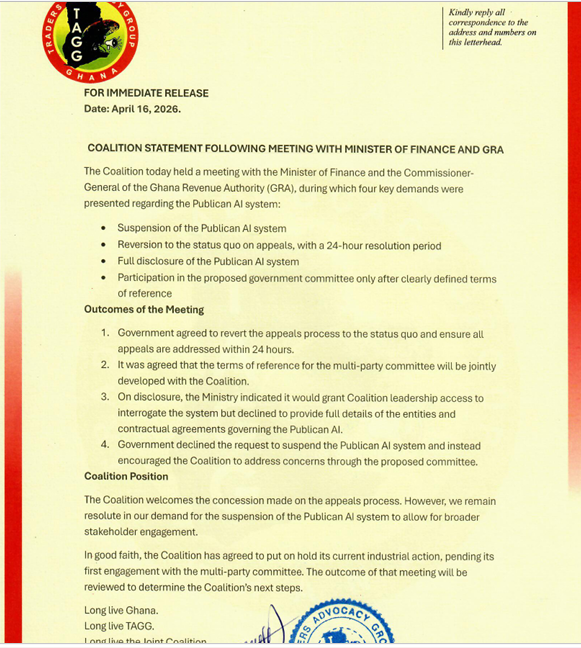 The Traders Advocacy Group Ghana (Traders Advocacy Group Ghana) and its coalition partners have temporarily suspended their planned industrial action following a meeting with the Minister of Finance and the Commissioner-General of the Ghana Revenue Authority (Ghana Revenue Authority) over concerns surrounding the Publican AI system.
