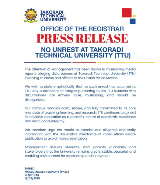Takoradi Technical University (TTU) has refuted reports of disturbances on its campus involving students and officers of the Ghana Police Service.