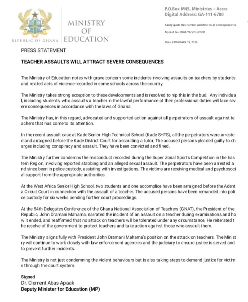 In a press statement dated February 19, 2026, the Ministry expressed grave concern over recent incidents involving attacks on teachers by students and related acts of violence in some schools across the country.