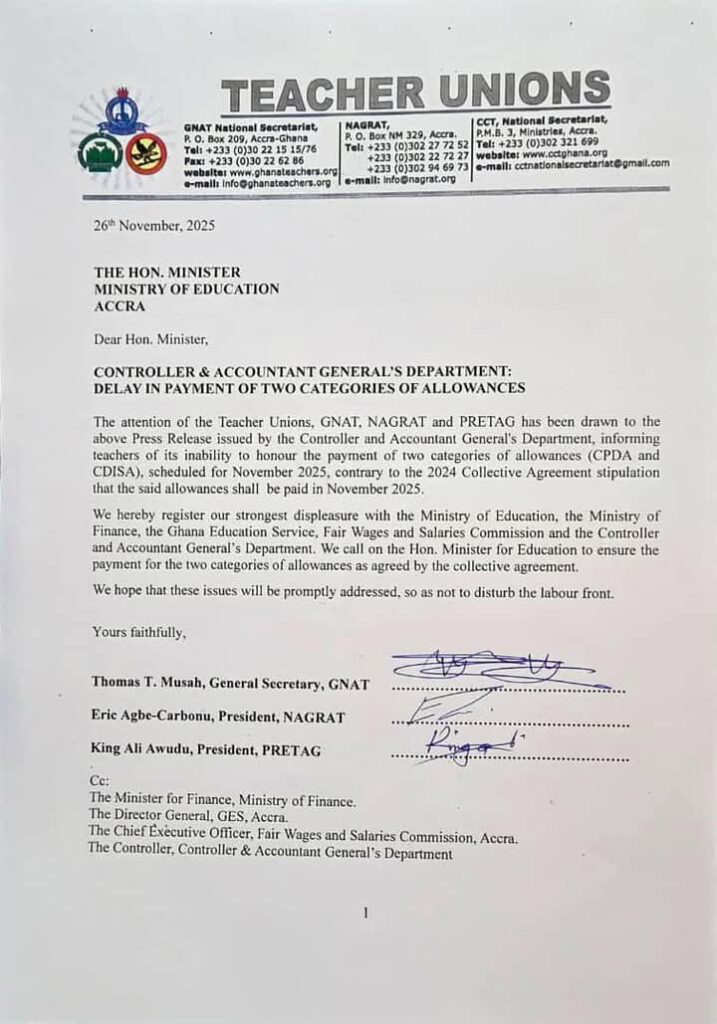 Three major teacher unions—GNAT, NAGRAT, and PRETAG—have expressed strong dissatisfaction over the failure of the Controller and Accountant-General’s Department (CAGD) to pay two categories of allowances owed to teachers in November 2025.