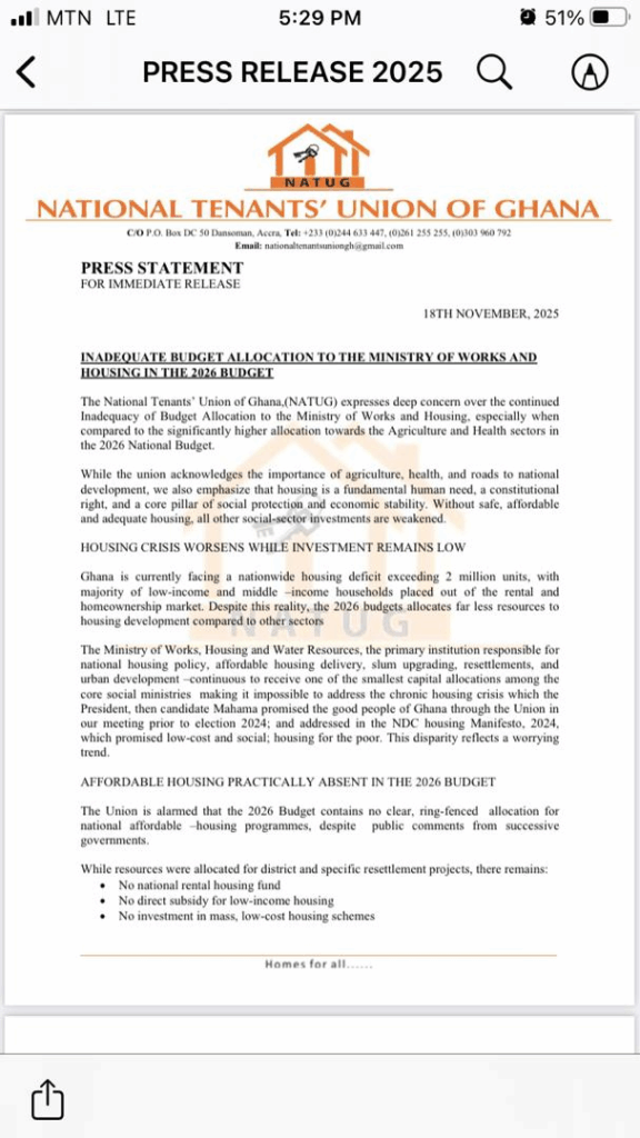 The National Tenants’ Union of Ghana (NATUG) has raised concerns over what it describes as the continued marginalisation of the housing sector in the 2026 national budget.