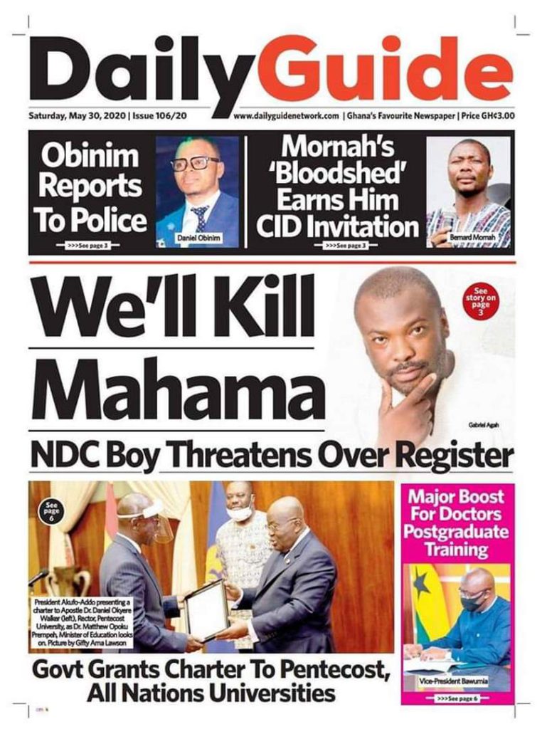 The Weekend’s Newspaper Headlines SourceAdomonline.com Newspaper Headlines May 30, 2020 8:52 am - Audio By Carbonatix FacebookWhatsAppTwitterTelegramEmailPinterestPrint Previous articleFirst two UN peacekeepers die of coronavirusNext articleA touching photo of how two newlyweds shared their first kiss through face masks RELATED ARTICLES Newspaper Headlines Newspaper headlines: Monday, November 24, 2025 Newspaper Headlines Newspaper headlines: Friday, November 21, 2025 Newspaper Headlines Newspaper headlines: Thursday, November 20, 2025
