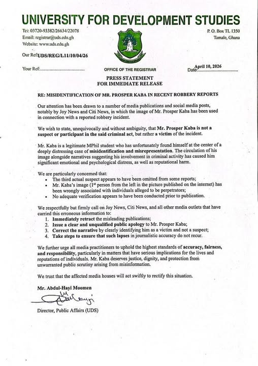 The University for Development Studies (UDS) has stated that its MPhil student, Mr. Prosper Kaba, was mistakenly identified in both traditional and social media reports as being connected to a recent robbery case in Tamale.