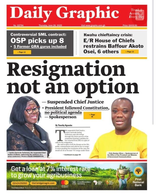 Thursday June 26 2025 Newspaper Headlines Newspaper Headlines June 26, 2025 7:22 am - Audio By Carbonatix FacebookWhatsAppTwitterTelegramEmailPinterestPrint Previous articleUK to host Trump for full state visit later this yearNext articleSuspended Chief Justice’s public address ‘most regrettable’ – Kwakye Ofosu TagsNewspaper headlines RELATED ARTICLES Education Education Ministry announces payment of outstanding teacher allowances Local News Police restore calm in Boadua chieftaincy dispute Business Controller pays delayed education sector allowances with December salaries