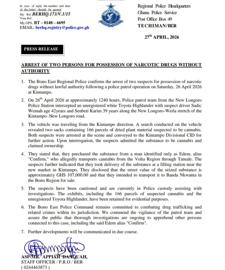 In a statement issued by the Bono East Regional Police Command on Monday, April 27, the arrests were made a day earlier, Saturday, April 26, 2026, at Kintampo.