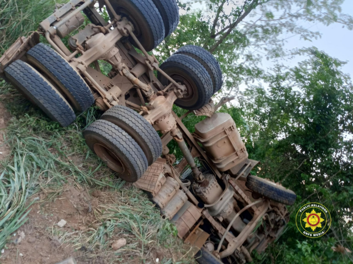 The accident, which occurred in the late afternoon, left the vehicle extensively damaged, with its carriage overturned and the head detached from the main body. The trailer was reportedly transporting 340 sacks of dried cassava from Kpandai to Juapong at the time of the incident.