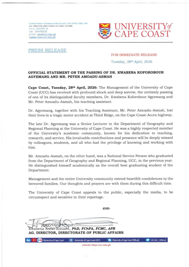 The University of Cape Coast has been thrown into mourning following the tragic deaths of two of its members, Dr Kwabena Koforobour Agyemang and his Teaching Assistant, Peter Amoadu-Asmah, who lost their lives in a road accident at Third Ridge along the Cape Coast–Accra highway.