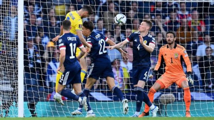 A heroic Ukraine roused a performance of spirit, endeavour and courage to stun Scotland and earn a historic World Cup play-off final against Wales.