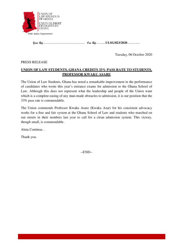 “The Union commends Professor Kwaku Asare (Kwaku Azar) for his consistent advocacy works for a free and fair system at the Ghana School of Law and students who marched on our streets in their numbers, last year to call for a clean admission system,” the statement read.
