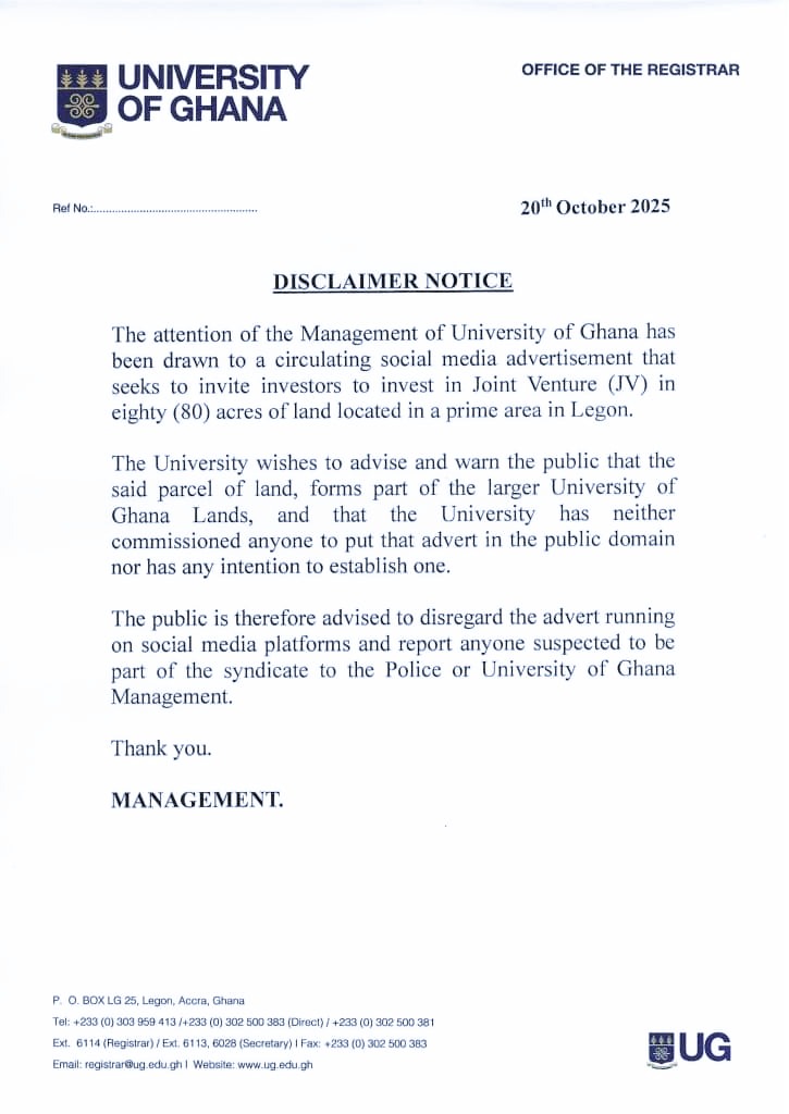 “The University wishes to advise and warn the public that the said parcel of land forms part of the University of Ghana’s property. The University has neither authorized anyone to publish such an advert nor has it expressed any intention to initiate such a venture,” the statement read.