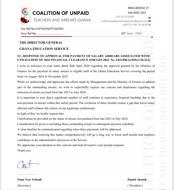 A group known as the Coalition of Unpaid Teachers and Arrears-Ghana has petitioned the Ghana Education Service (GES), expressing concern over the exclusion of some salary arrears from recently approved payments for staff.