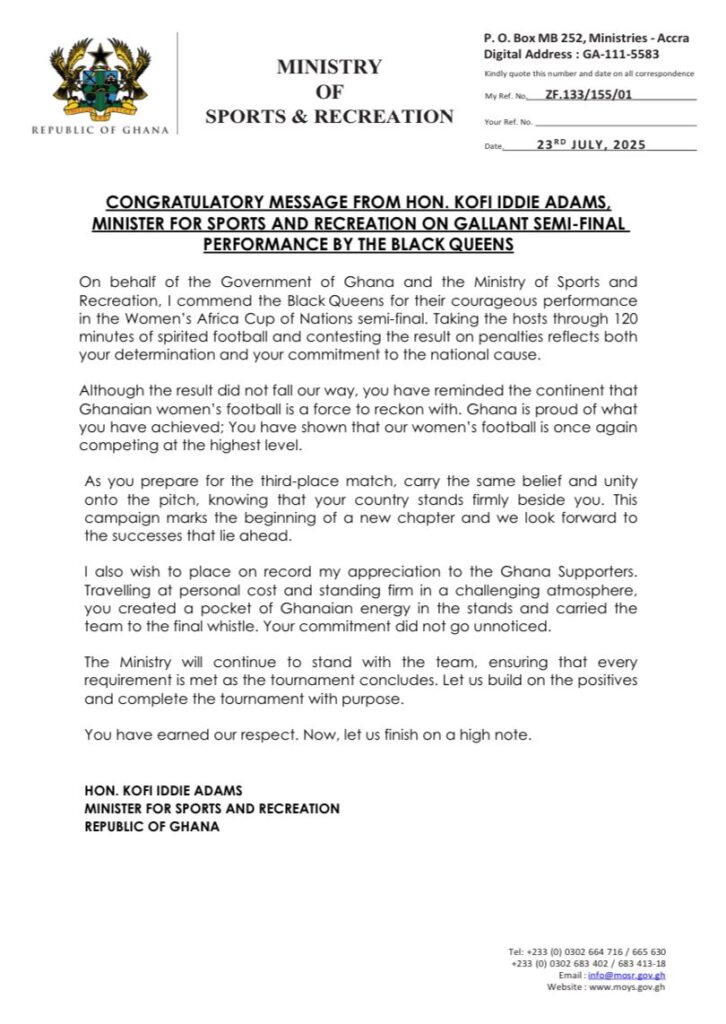 “I commend the Black Queens for their courageous performance in the Women’s Africa Cup of Nations semi-final,” he said.
