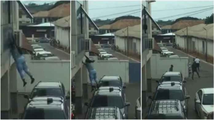 A lady has been spotted in a viral video jumping from the window of a bank in Kumasi after robbing the bank.