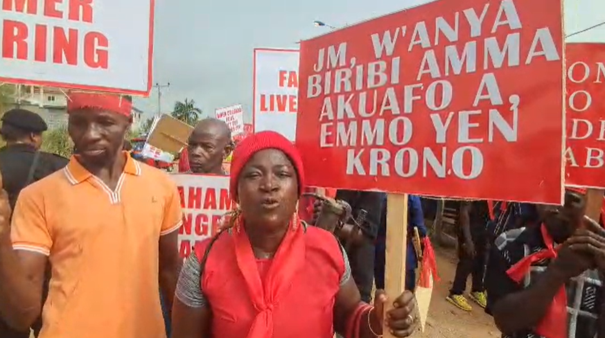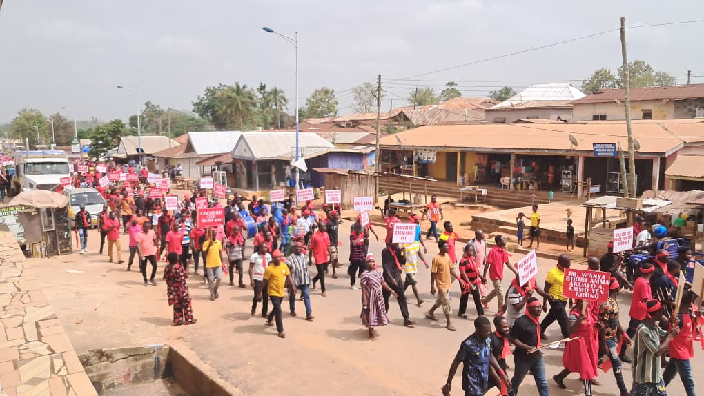 The demonstration brought together farmers from districts including Sefwi Wiawso, Juaboso, and Bia West, who marched through principal streets holding placards with messages such as “Restore Our Price Now” and “Cocoa Sustains Ghana, Don’t Neglect Farmers.”
