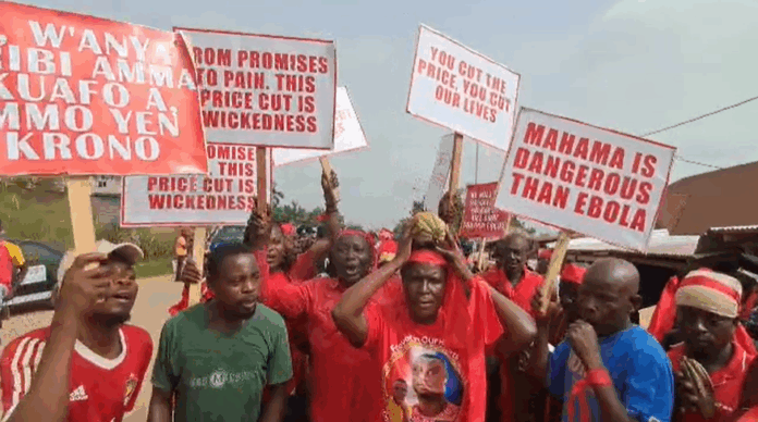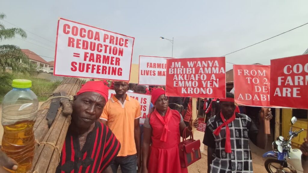 Cocoa farmers in the Western North Region have staged a protest against the recent reduction in cocoa prices, which dropped from GH¢3,625 to GH¢2,587 per bag.