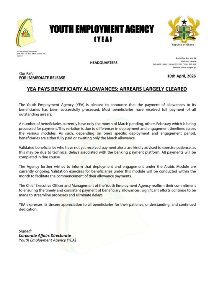 The Youth Employment Agency (YEA) has announced that it has successfully processed allowance payments for its beneficiaries, with the majority receiving all outstanding arrears.