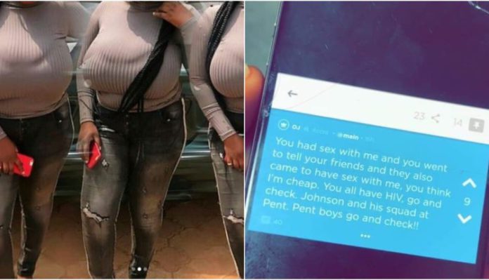 The slay queen figuring out the boys had connived to sleep with her disclosed she has HIV/AIDS and that the boys should go and check.